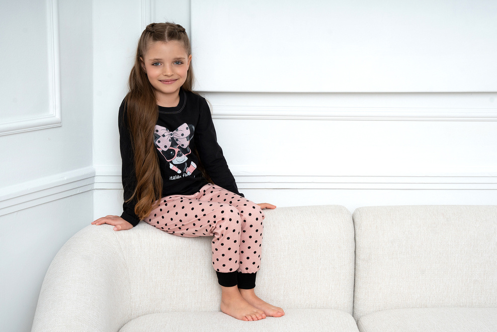 Pyžamo obsahuje nohavice v ružovej a čiernej hráškovej farbe, zakončené rebrovaným lemom, a mikinu so sladkou potlačou.