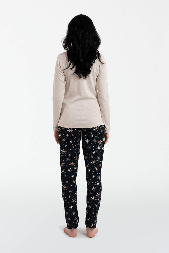 Módne dámske pyžamá sú skvelé na služobné cesty a dovolenky, ako aj na doma. Jeho jednoduchý, klasický strih je zárukou pohodlia a slobody a prírodný materiál poskytne dostatočný tepelný komfort počas chladných nocí. Bavlnené dámske pyžamo s dlhými nohavicami a dlhými rukávmi je zakončené okrúhlym výstrihom, pod ktorým je ozdobná, očarujúca mašľa a krásny vzor snehových vločiek. Takéto ženské pyžamo sľubuje príjemný spánok. Dámske pyžamo je k dispozícii vo veľkostiach S až XL a v odtieňoch čiernej a béžovej melanžovej.