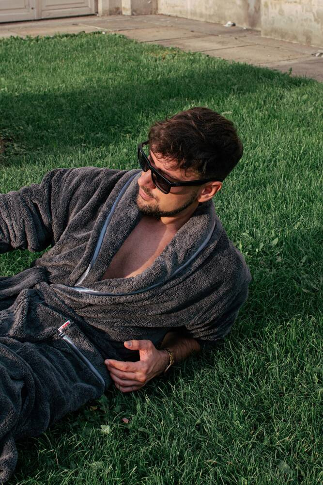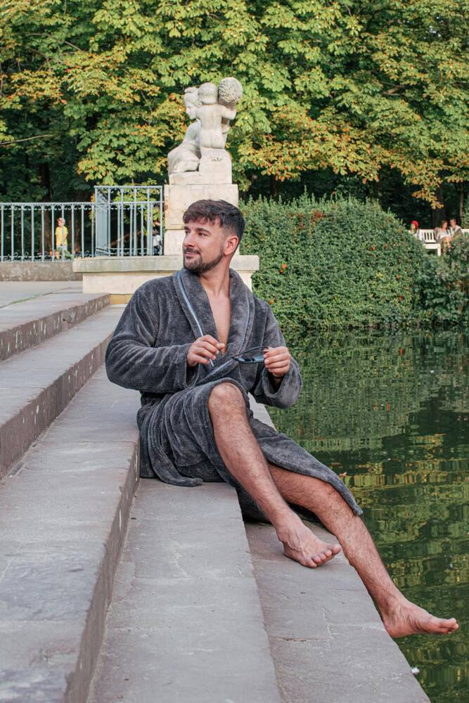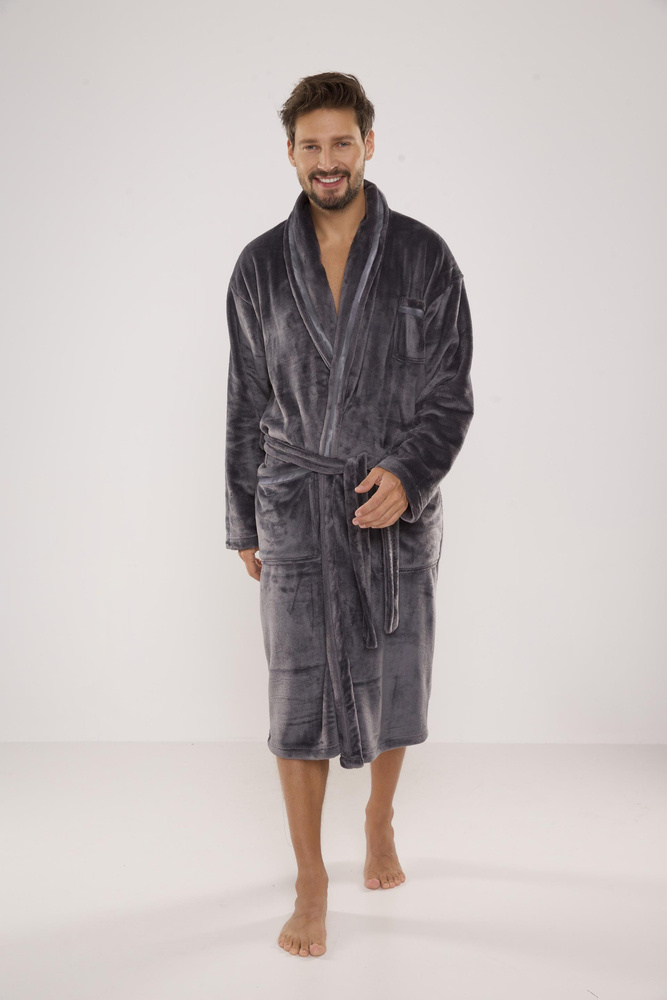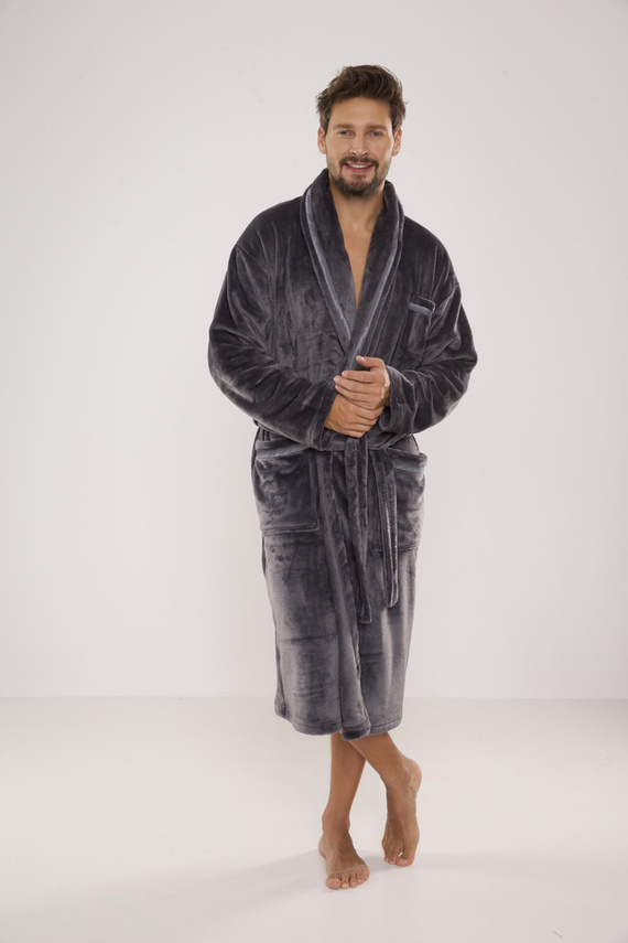 Pánsky dlhý župan z mäkkej pleteniny. Viazanie v páse, vonkajšie vrecká na bokoch, náprsné vrecko. Príjemné a príjemné na dotyk, zaručuje pohodlie pri nosení. Hlavnou výhodou tohto modelu je hrejivá a na dotyk príjemná plyšová tkanina, ktorá dokonale absorbuje vodu.