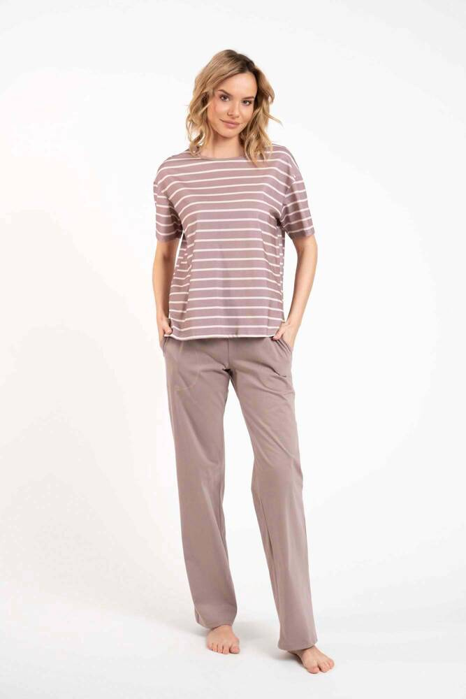 Dámske pyžamo s dlhými nohavicami a krátkymi rukávmi je skvelou voľbou na jesenné večery, či už strávené doma alebo na dovolenke či služobnej ceste. Ľahký strih dámskeho pyžama - voľný vrchný diel a rovné nohavice - zabezpečí pohodlný spánok, zatiaľ čo 100 % bavlna sa postará o potešenie vašej pokožky a umožní jej dýchať. Dámska súprava na spanie je k dispozícii v dvoch farbách - grafitovej a cappuccino - a vo veľkostiach S až XXL.