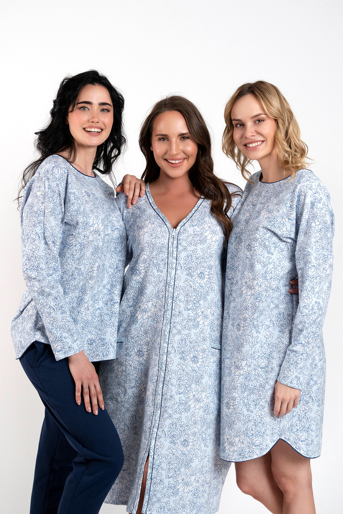 Pohodlné pyžamo - dobrý spánok! Toto dámske tričko na spanie z mikiny, mäkké a príjemné na pokožku, k tomu určite prispeje. Jeho voľný strih poskytuje voľnosť pohybu a dĺžka po kolená je mimoriadne pohodlná. Spodná časť dámskej nočnej košele je mierne zaoblená a na bokoch sú malé výrezy, ktoré jej dodávajú štýl. Dámske bavlnené tričko na spanie je ideálne na chladnejšie noci a jeho oku lahodiaci kvetinový vzor osloví každú ženu. Bavlnená nočná košeľa je k dispozícii vo veľkostiach S až XXXL a v modro-bielej farbe.