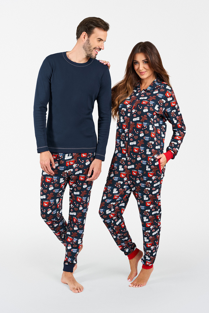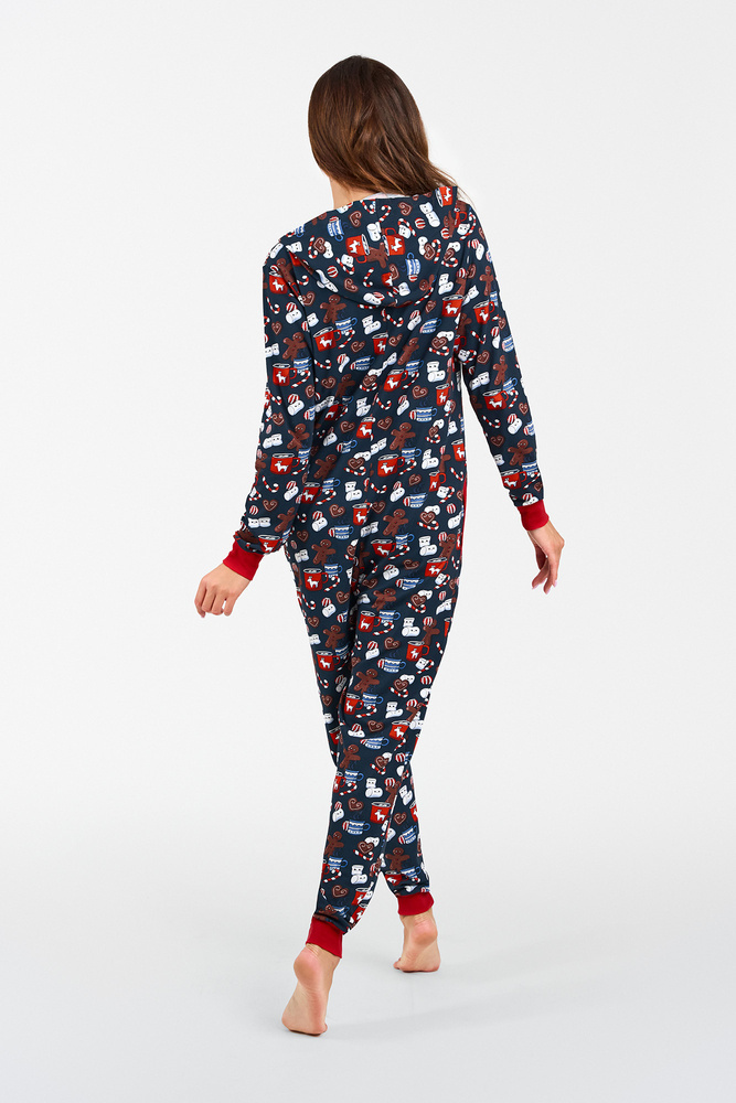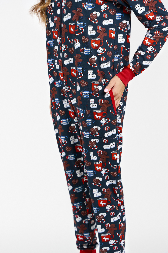 Takýto odev je v posledných rokoch skutočným hitom! Dámske pyžamo - spací úbor je ideálny na chladné noci. Ideálne na relaxáciu pri šálke kakaa pred televízorom. Dámsky bavlnený overal udrží vašu pokožku spokojnú a poskytne primeraný tepelný komfort, zatiaľ čo jeho strih je zárukou voľnosti. Nočná kombinéza so zipsom a kapucňou, s rebrovanými rukávmi a nohami, je dokonalou alternatívou klasického pyžama - bude nielen veľmi pohodlná, ale aj zaujímavá. Je zdobená roztomilým vzorom sušienok, ideálna na lenivý večer doma. Dámsky bavlnený overal je k dispozícii vo veľkostiach S až XL, v tmavomodrej a červenej farbe.