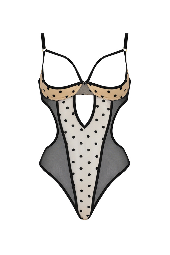 Otvorené vystužené košíčky s kosticami v kombinácii s ramienkami okolo pŕs. Výstrihy, ktoré zoštíhľujú siluetu, a tie roztomilé bodky... nádherná kombinácia vysokokvalitných materiálov, vďaka ktorým toto body vyzerá úžasne. Model je k dispozícii v dvoch farebných verziách - čiernej a béžovej.