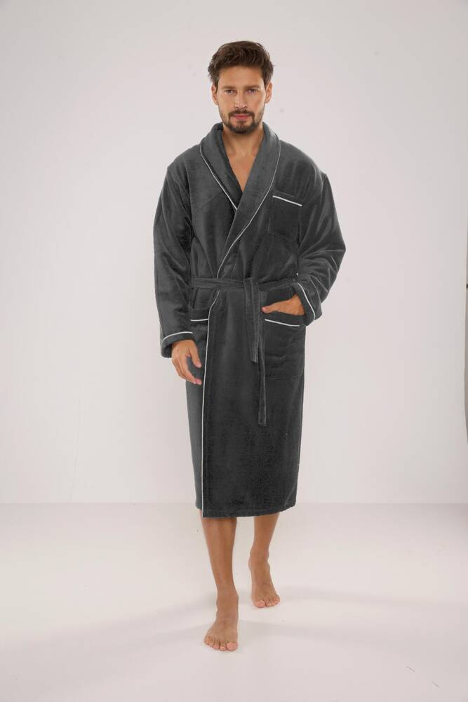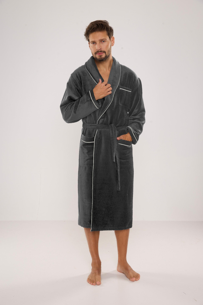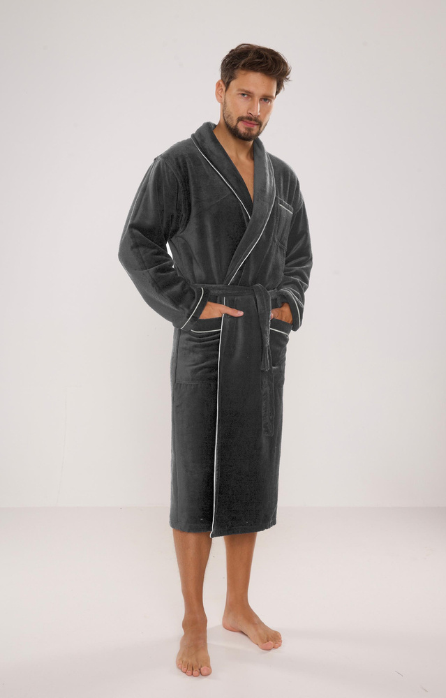 Pánsky dlhý velúrový župan. Model so šálovým golierom, uviazaný v páse, s dvoma vreckami na bokoch a jedným na hrudi. Wvyrobené z 50 % mäkkej froté bavlny. Material príjemné s jemným pocitom a vynikajúcou absorpciou vody.