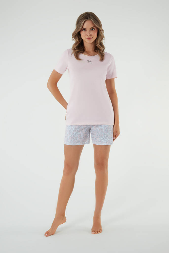 Dámam, ktorým je vždy horúco, poskytne úľavu a pohodlie štýlové dámske pyžamo s krátkymi nohavicami a krátkymi rukávmi. Prírodný, priedušný materiál je mäkký, príjemný a bezpečný pre pokožku a rovný strih zaistí pohodlie a voľnosť pohybu. Toto tvarované dámske pyžamo má pekné kvetinovo zdobené šortky s funkčnými vreckami a netlačiacou gumou v tuneli a tričko s okrúhlym výstrihom s malou, očarujúcou mašľou.