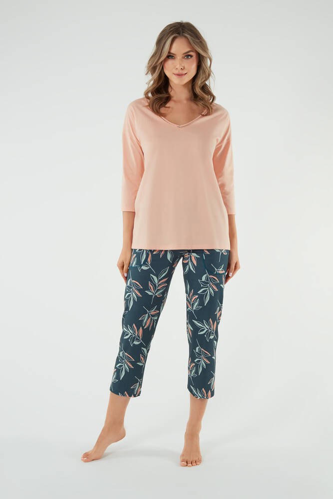Dámske pyžamo pre ženy, ktoré si cenia eleganciu a pohodlie. Má uvoľnený strih, ktorý určite ocenia mnohé ženy. Jednofarebná blúzka so srdiečkovým výstrihom a 3/4 dlhými rukávmi. Druhú časť dámskej pyžamovej súpravy tvoria nohavice s dĺžkou 7/8 so vsadenými vreckami a výraznou potlačou listov, ktorá prináša množstvo šarmu. Je potrebné dodať, že ide o pyžamo z bavlny - mäkké, pohodlné a príjemné na dotyk. Všetky sú k dispozícii v nadčasových, jemných farbách, takže si môžete vybrať ideálny model pre vás.