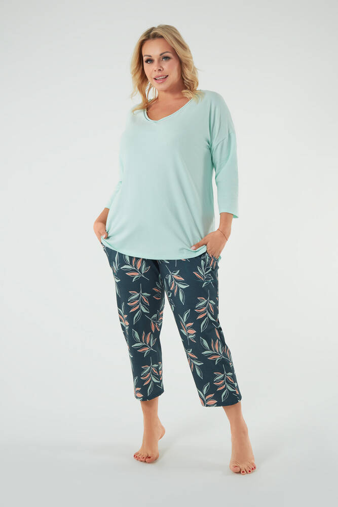 Dámske pyžamo pre ženy, ktoré si cenia eleganciu a pohodlie. Má uvoľnený strih, ktorý určite ocenia mnohé ženy. Jednofarebná blúzka so srdiečkovým výstrihom a 3/4 dlhými rukávmi. Druhú časť dámskej pyžamovej súpravy tvoria nohavice s dĺžkou 7/8 so vsadenými vreckami a výraznou potlačou listov, ktorá prináša množstvo šarmu. Je potrebné dodať, že ide o pyžamo z bavlny - mäkké, pohodlné a príjemné na dotyk. Všetky sú k dispozícii v nadčasových, jemných farbách, takže si môžete vybrať ideálny model pre vás.