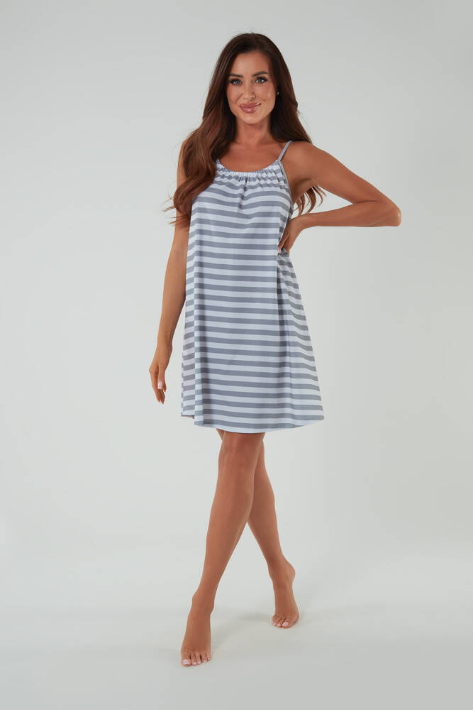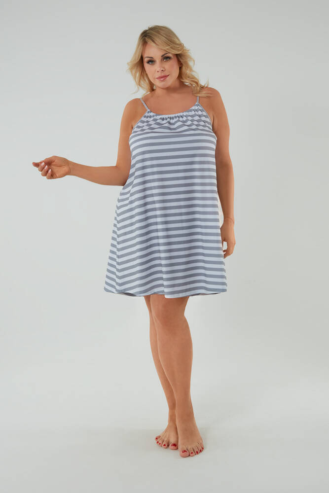 Nočná košeľa bez ramienok je skvelou voľbou pre ženy, ktoré oceňujú eleganciu a štýlový vzhľad. Má voľný trapézový strih, ktorý vám zaručí pohodlie počas teplejších nocí. Horný okrúhly výstrih s ozdobným ryhovaním - vpredu aj vzadu. Navyše si môžete nastaviť dĺžku ramienok aj šírku výstrihu. Ľahkú nočnú bielizeň zdobí nadčasový klasický pruhovaný vzor. Má praktickú dĺžku pred kolenom. Naša nočná košeľa bola ušitá z mäkkej a telu príjemnej bavlny.