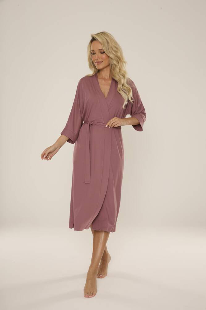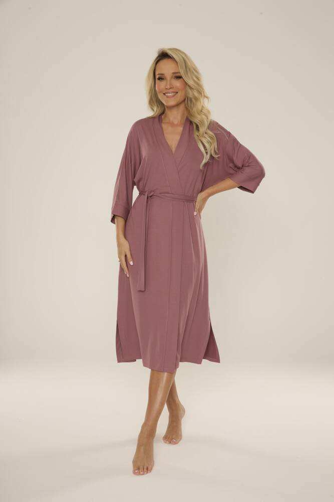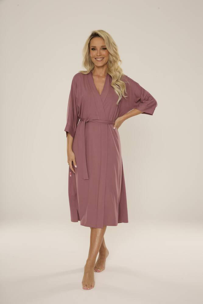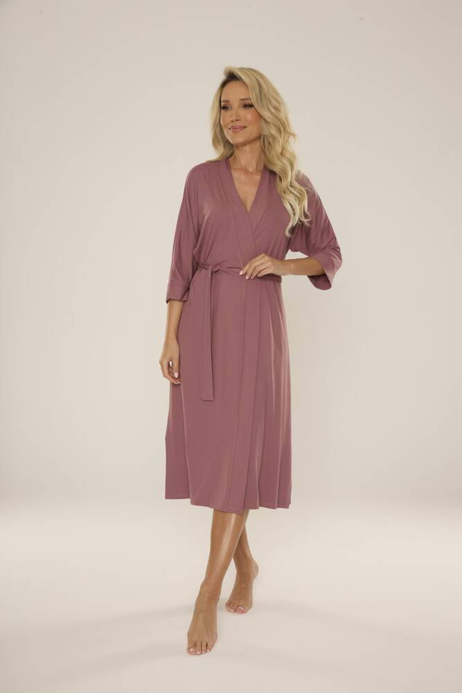 • Elegantný dámsky župan 942 Visa značky De Lafense z vysokokvalitnej viskózy. Dlhý strih, 3/4 rukáv a pás vytvárajú ženský a klasický vzhľad.