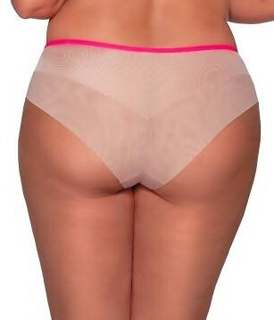 Dámske nohavičky klasického strihu . Predná časť z priehľadnej sieťoviny zdobená energickou kvetinovou výšivkou. Spodná časť z dvojitého mikrovlákna, plochý pás zvýraznený fluo ružovou gumičkou. Chrbát z mikrovlákna a dvojitej sieťoviny
