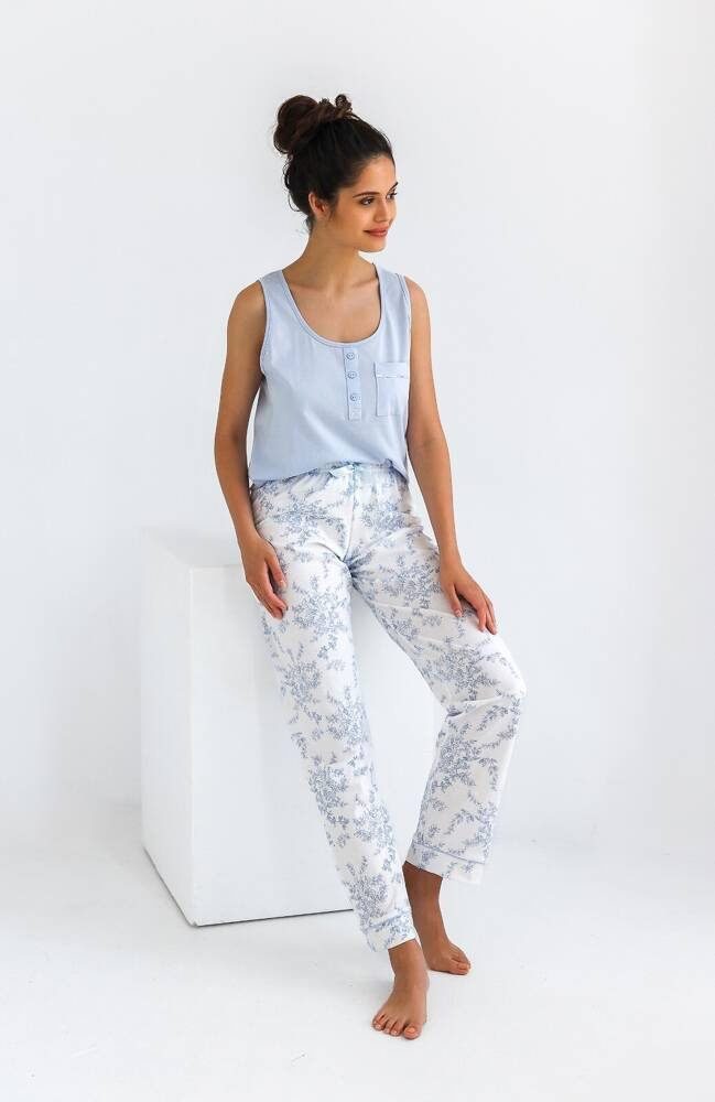Dámske letné pyžamo - tričko so širokými ramienkami, výstrih zdobený gombíkmi. S voľnými dlhými nohavicami zo vzorovanej bavlny. Opasok so saténovou mašľou.