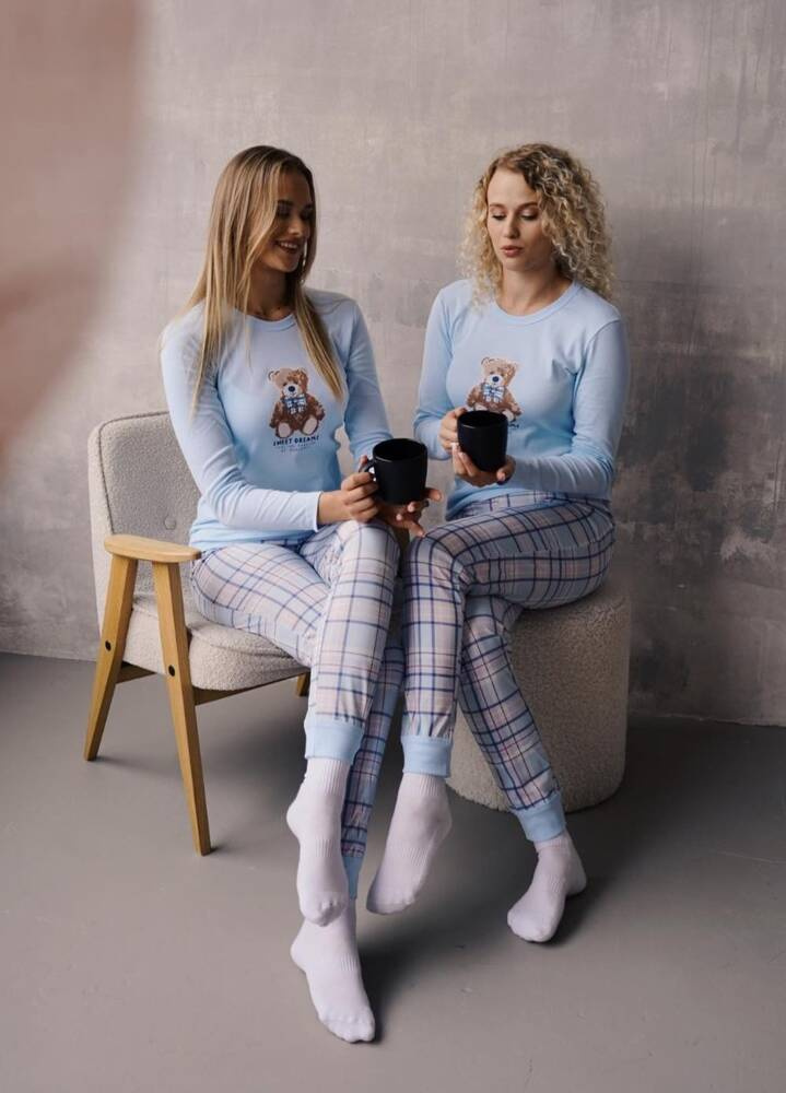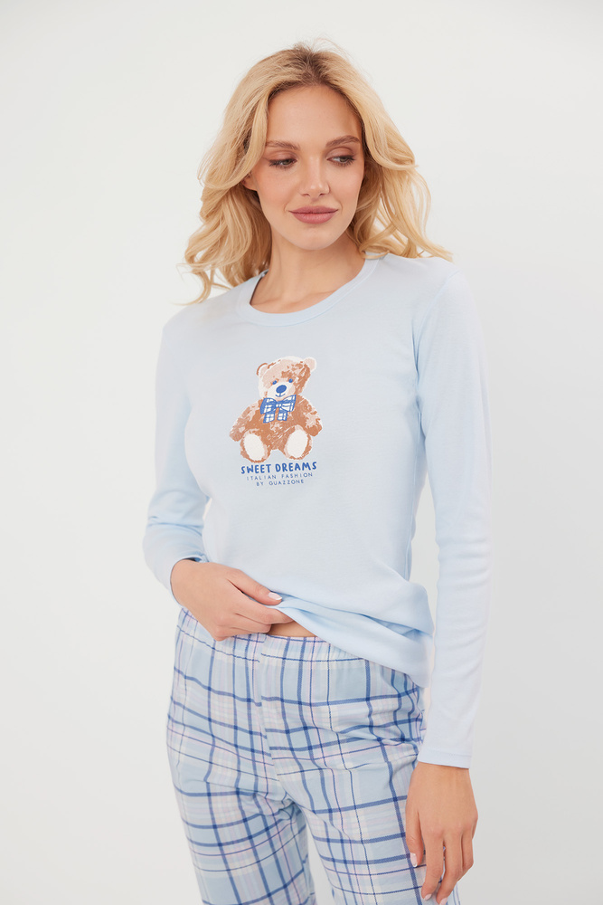 Dámske pyžamo Katrin sa vyznačuje mierne vypasovanou líniou, ktorá poskytuje pohodlie a zvýrazňuje siluetu. Blúzka s dlhými rukávmi má okrúhly výstrih a ozdobnú potlač s roztomilým medvedíkom a nápisom "Sweet Dreams" Talianska móda Guazzone. Nohavice klasického strihu s módnym károvaným vzorom v spodnej časti nohavíc majú praktické šnúrky, ktoré držia nohavice na mieste a zabraňujú ich vyťahovaniu počas spánku.