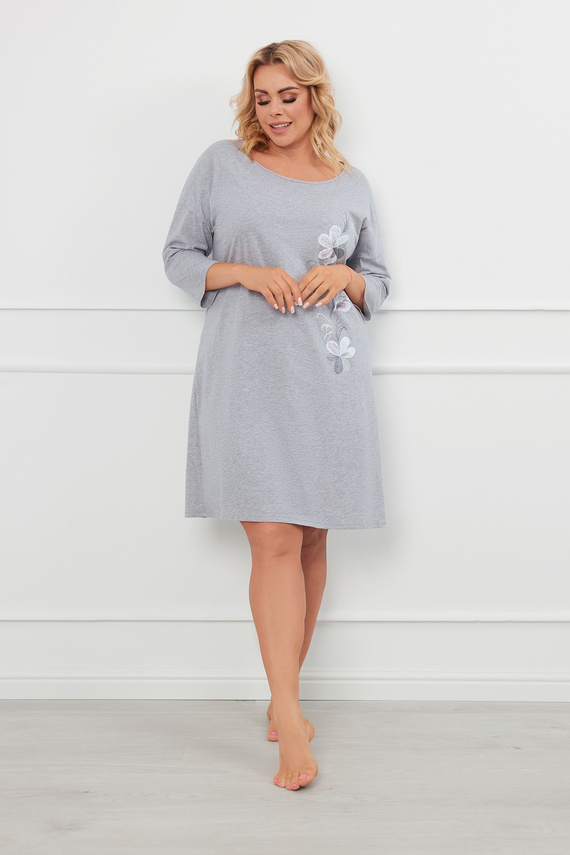 Tu je esencia ľahkosti a ženského šarmu. Dámska nočná košeľa s rovným strihom pre pohodlný spánok. Má okrúhly výstrih a 3/4 dlhé rukávy. Jeho ozdobou je jemná kvetinová potlač. Celá je vyrobená z mäkkej bavlny.