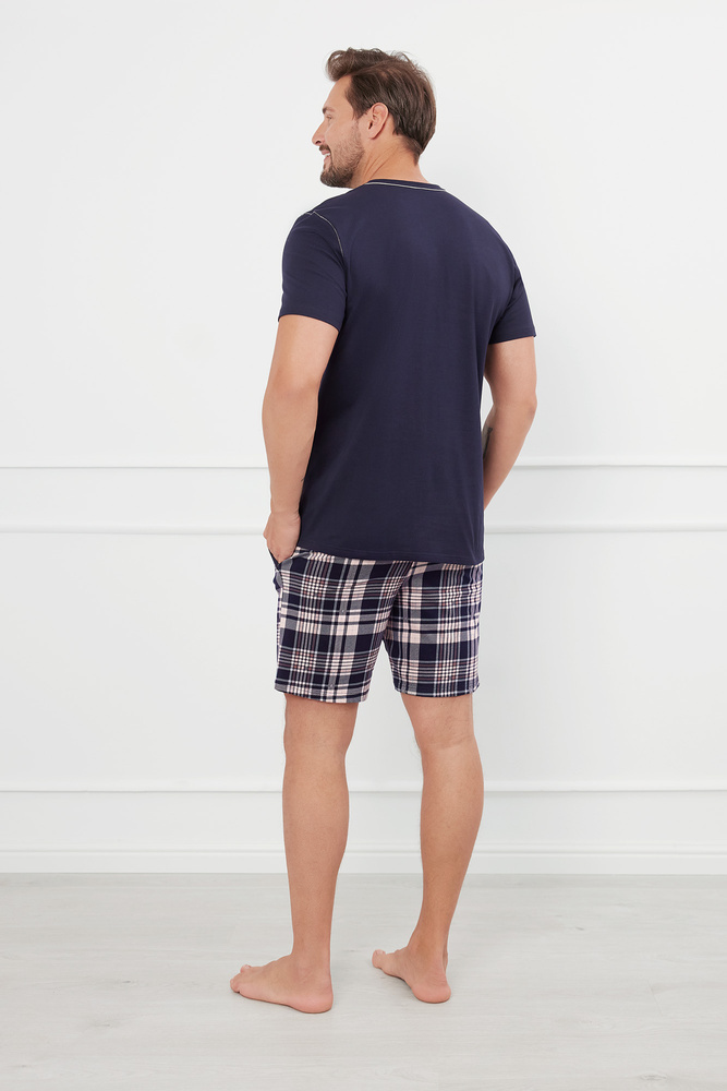 Pánske pyžamo v jednoduchom, nadčasovom strihu. Model má okrúhly výstrih, krátke rukávy a krátke nohavice. Vrchná časť je jednofarebná, zatiaľ čo spodná časť je vzorovaná, s pestrým károvaným vzorom. Kontrastné prešívanie dodáva triedu a štýl. Na bokoch sú dve vrecká s možnosťou zapnutia. Výhodou krátkeho pánskeho pyžama je aj bavlnený materiál - odolný, mäkký a poskytujúci dobrú cirkuláciu vzduchu.