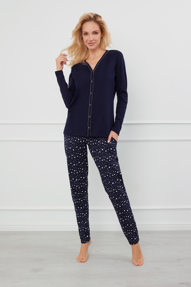 Dámske pyžamo bez gombíkov z bavlneného rebrovaného úpletu, ktoré sa vyznačuje nadčasovým dizajnom. Má klasický strih s dlhými rukávmi a véčkovým výstrihom, ktorý je lemovaný jemnou niťou v kontrastnej farbe. Dlhé nohavice s módnou potlačou hviezdičiek upútajú pozornosť. Praktické, vložené vrecká na bokoch. Keď k tomu pridáme skutočnosť, že ide o dámske pyžamo bez gombíkov, jasne označený panel s gombíkmi dodáva celému vzhľadu punc noblesy a pôvabu.