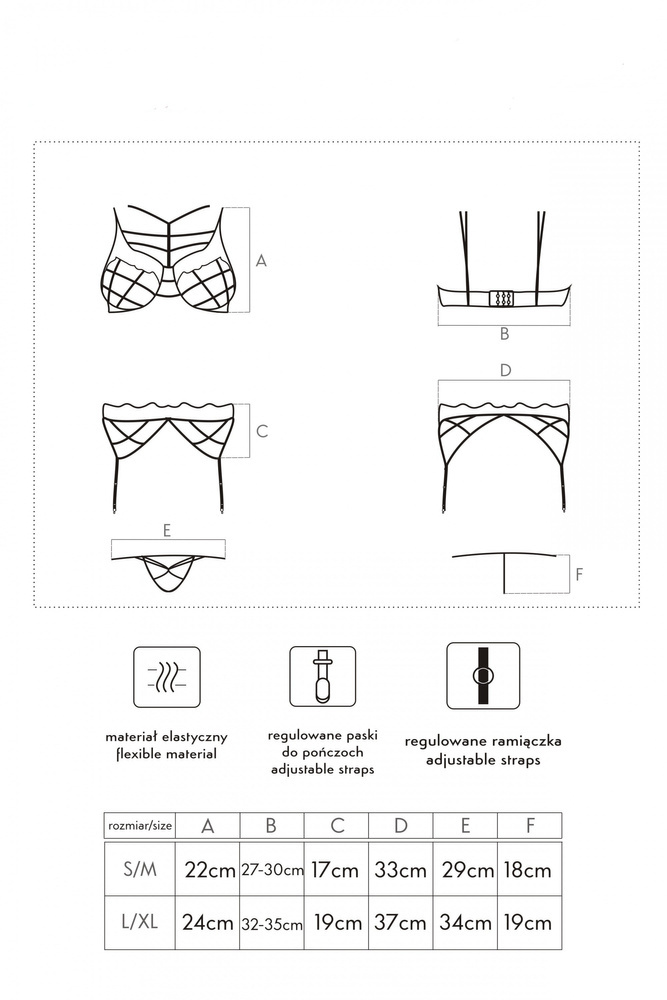 Elegantný strih súpravy spodnej bielizne. Podprsenka s tenkými, nastaviteľnými ramienkami. Tanga a podväzkový pás sú súčasťou balenia.