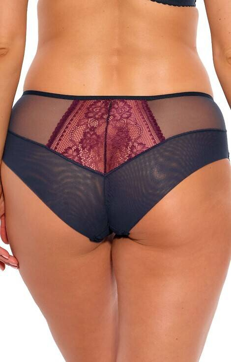 Dámske nohavičky s plným, vstavaným strihom. Vyrobené z priehľadnej sieťoviny a ažurovej čipky. Plochý elastický pás.