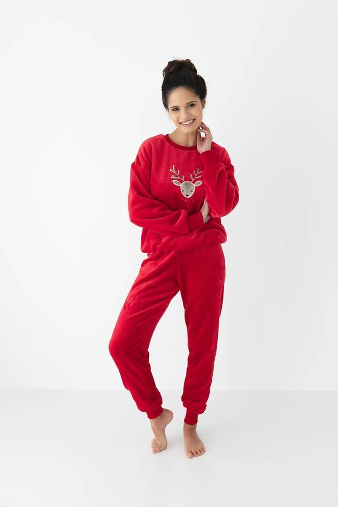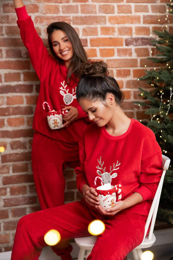 Dámske pyžamo z kvalitnej mäkkej tkaniny. Tričko s dlhými rukávmi zdobené slávnostným motívom.S dlhými pevnými nohavicami. Nohavice zakončené šnúrkou na stiahnutie. Súprava dokonale zvýrazňuje tvary.