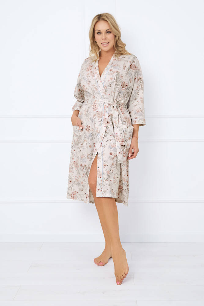 Tu je dámsky župan, ktorý má klasický strih pre väčšie pohodlie. Ozdobné lemovanie na okrajoch. Na úrovni pása sú pútka na opasok. Kvetinová potlač dodáva celkovému vzhľadu romantický nádych, triedu a jemnosť. Dve vrecká na bokoch, vďaka ktorým je model praktickejší. Všetky sú vyrobené z hladkej 100 % bavlny.