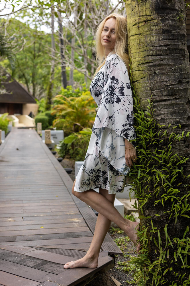 Uvoľnený tvar so širšími rukávmi dodáva ľahkosť a eleganciu. Opasok vám umožní nastaviť si pás podľa potreby. Vysokokvalitný vzorovaný satén. Plášť môžete použiť aj ako kombinézu na plavky.