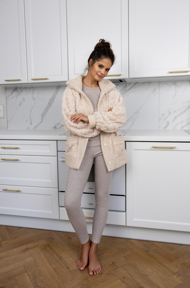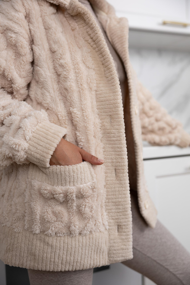 Pohodlný dámsky župan. Vyrobené z mäkkej, nadýchanej mäkkej pleteniny. Model do polovice stehien, rovný strih s dlhými rukávmi. Na úrovni bokov má dve vrecká. Veľmi pohodlný strih, jemne prispôsobený telu. Osloví ženy, ktoré milujú jemnosť a voľnosť.