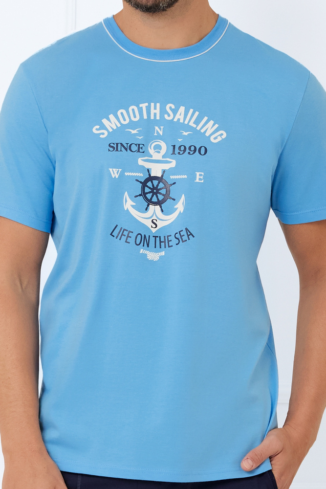 Pánske krátke pyžamo v námorníckom štýle zo 100 % bavlny. Vyznačuje sa jednoduchým a pohodlným strihom. Tričko s krátkymi rukávmi, okrúhlym výstrihom a lemovaním je zdobené potlačou kotvy a štýlovým nápisom, ktorý zdôrazňuje jeho charakter. Súpravu dopĺňajú pevné krátke šortky s vreckami.