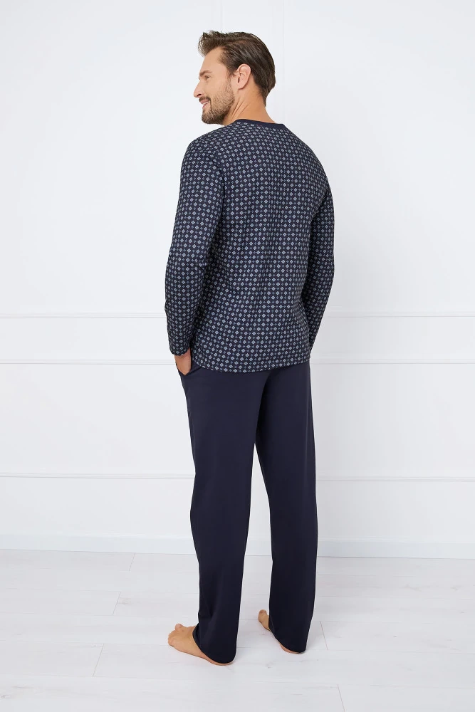 Pánske pyžamo s dlhými rukávmi je určené pre mužov, ktorí hľadajú módne a štýlové nočné oblečenie. Má klasický strih, ktorý vám zabezpečí pohodlie počas spánku. Vrchný diel je rozopnutá blúzka, kde vzorovaná potlač vystupuje do popredia v duete s výrazným panelom gombíkov. Má dve našité vrecká. Spodky sú dlhé, pevné nohavice. Všetky sú vyrobené zo 100 % bavlny.