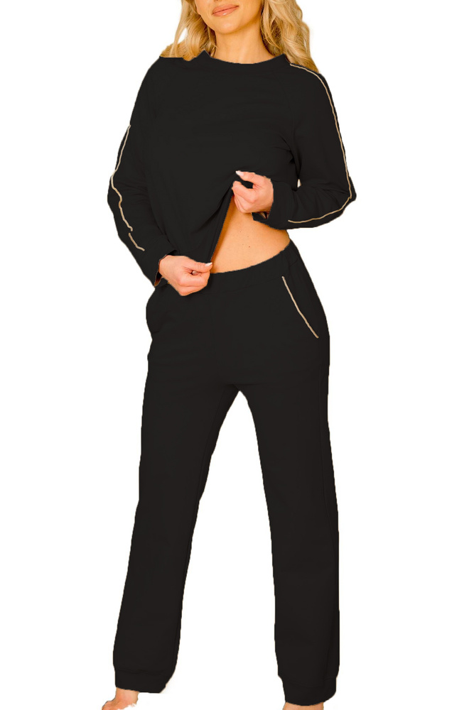 Súprava sa skladá z mikiny klasického strihu a nohavíc s pohodlným pásom a vreckami. Výrazné ozdoby v podobe jemného lesklého prešívania na rukávoch a vreckách dodávajú teplákom jedinečný charakter.