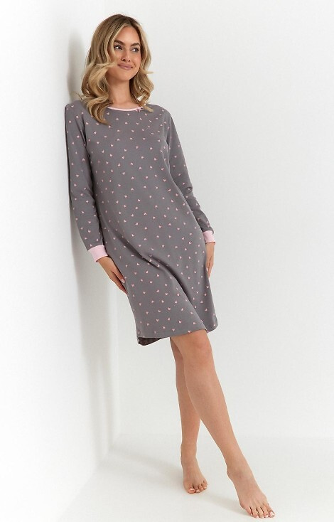 Košeľa má okrúhly výstrih zdobený pôvabnou mašľou, ktorá dodáva celkovému vzhľadu romantický nádych. Srdiečkový vzor mu dodáva ľahký a ženský nádych. Dlhý rukáv zakončený rebrovaným lemom chráni pred chladom a dĺžka po kolená poskytuje voľnosť a pohodlie počas spánku.