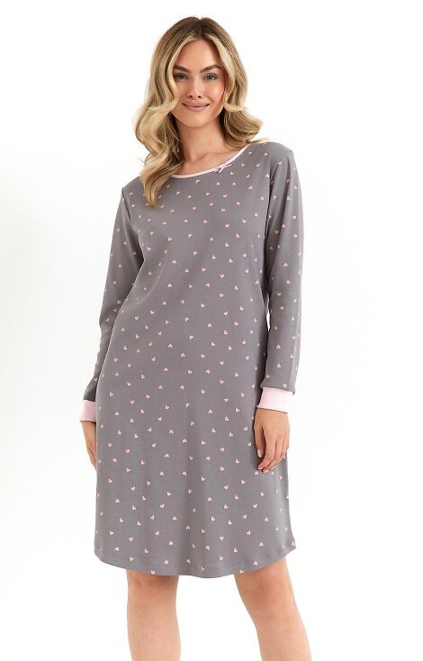 - Nočná košeľa z vysokokvalitného bavlneného interloku. Dlhý rukáv, srdiečkový vzor, ozdobná mašľa vo výstrihu a rebrované manžety. Dĺžka po kolená.