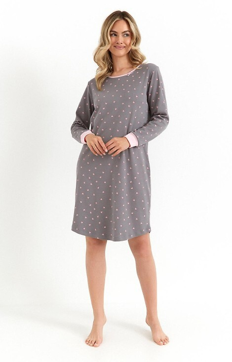 493 Dámska nočná košeľa Cana graphite - interlocková bavlna, srdiečka, dlhý rukáv