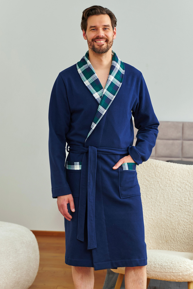 Model 7366 je určený pre mužov, ktorí oceňujú pohodlie a dobrý štýl. Župan je vyrobený z vysokokvalitnej bavlny a zahaľuje telo do mäkkého prírodného materiálu. Klasický strih v tmavomodrej farbe dopĺňajú detaily z károvanej látky na golieri a vreckách. Zaväzovanie v páse zaručuje pohodlné nosenie, zatiaľ čo praktické vrecká zvýrazňujú funkčnosť modelu. Ideálne na chladné rána aj večery s knihou alebo seriálom. Toto je domáci luxus v najlepšej podobe.