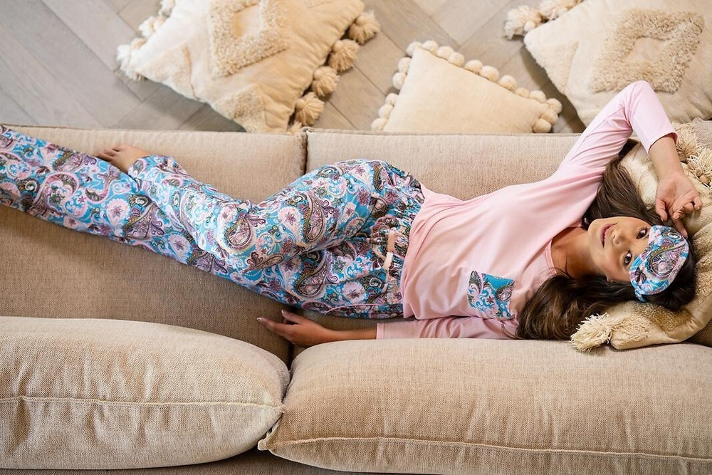 Blúzka s dlhý rukáv má ženskú, mäkkú siluetu, ktorá zvýrazňuje postavu a zároveň umožňuje úplnú voľnosť pohybu. Nohavice s rovnakým vzorom alebo v tlmenej farbe vytvoria ucelený elegantný celok.