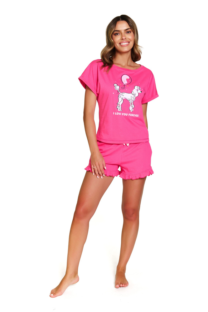 Doctor Nap 7357 je dámske pyžamo, ktoré spája pohodlie s dievčenským šarmom. Je vyrobená z kvalitnej a mäkkej bavlny a je ideálna na letné noci a rána. Tričko s krátkym rukávom zdobí rozkošná potlač pudla a nápis "I love you furever". Krátke šortky s volánom a saténovou mašľou dodávajú ľahkosť a šarm. Toto je dokonalé pyžamo pre ženy, ktoré sa rady hrajú s módou - aj doma.