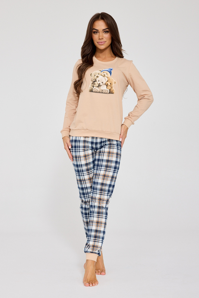 Vrchná časť pyžama je tričko s dlhými rukávmi, zdobené veľkou potlačou medvedíka - tento motív navodzuje zimnú atmosféru a zároveň pôsobí veľmi esteticky a žensky. Klasické kockované nohavice ho krásne dopĺňajú a dodávajú mu slávnostný nádych, takže pyžamo je ideálne na december a celú zimu.