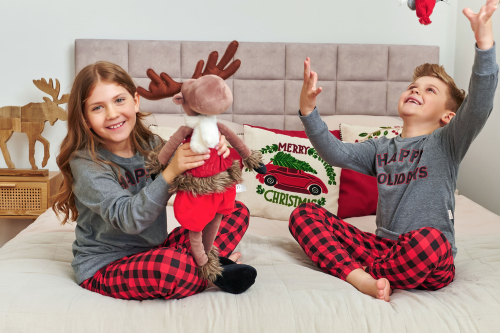 Sivý top s potlačou "Happy Holidays" navodí sviatočnú náladu, zatiaľ čo červeno-čierne kárované nohavice dodajú štýl a zábavu. Voľný strih neobmedzuje pohyb, takže pyžamo je vhodné aj na hranie doma.