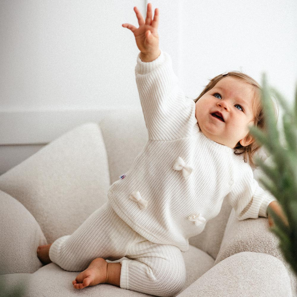 • Detský sveter Eevi v ecru farbe. S rozkošnými mašľami na prednej strane a rukávmi ukončenými rebrovaným lemom. Mäkké, pohodlné a ideálne na chladnejšie dni.