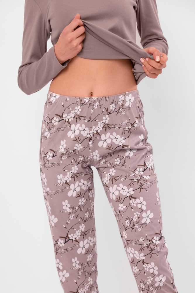 • Dámske pyžamo Kimuri z bavlny, farba cappuccino. Blúzka s dlhými rukávmi a mašľou vo výstrihu, nohavice s kvetinovou potlačou, vreckami a elastickým pásom.