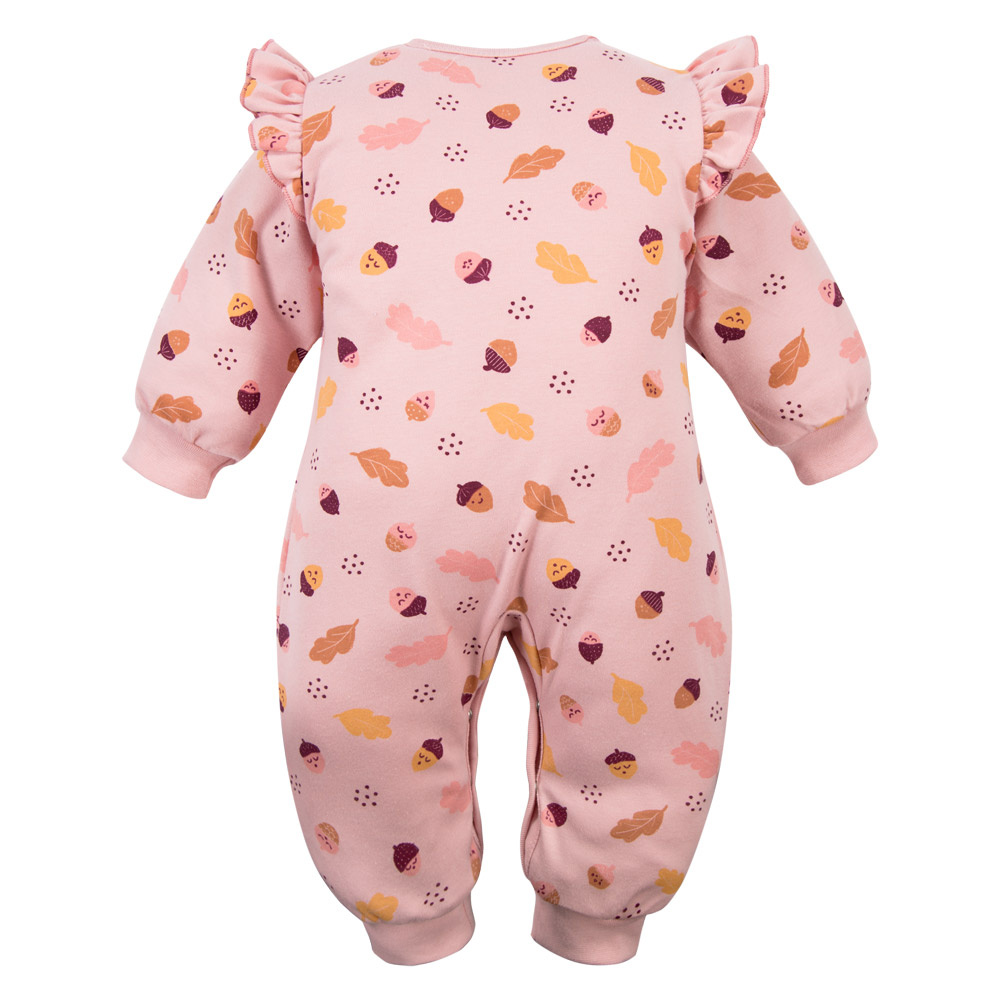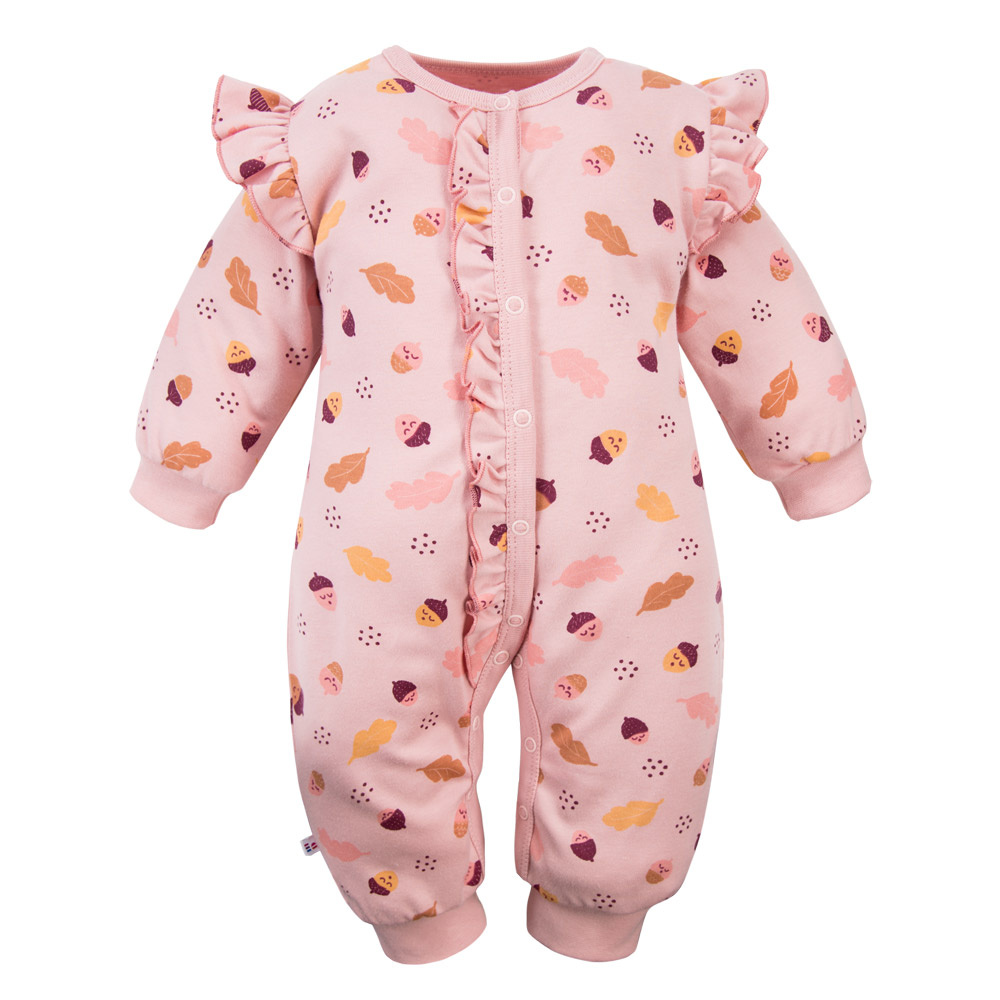 Model bez nožičiek poskytuje dieťaťu voľnosť pohybu a praktické stláčacie cvočky uľahčujú rýchlu výmenu. Rozkošná potlač dodáva celkovému vzhľadu jemný, detský nádych.