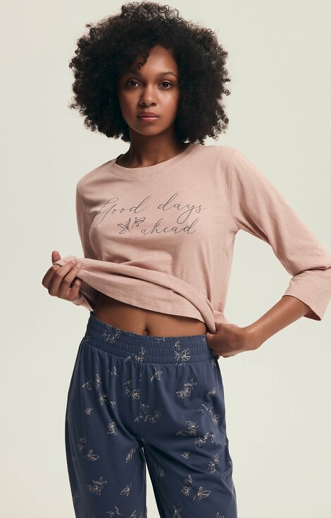 Dámske pyžamo Henderson Delanie 43699 je dokonalou kombináciou pohodlia a ženského štýlu. Súprava obsahuje tričko s 3/4 rukávmi, okrúhlym výstrihom a ozdobnou potlačou na prednej strane, ako aj nohavice v rybárskom štýle s módnou kvetinovou potlačou.