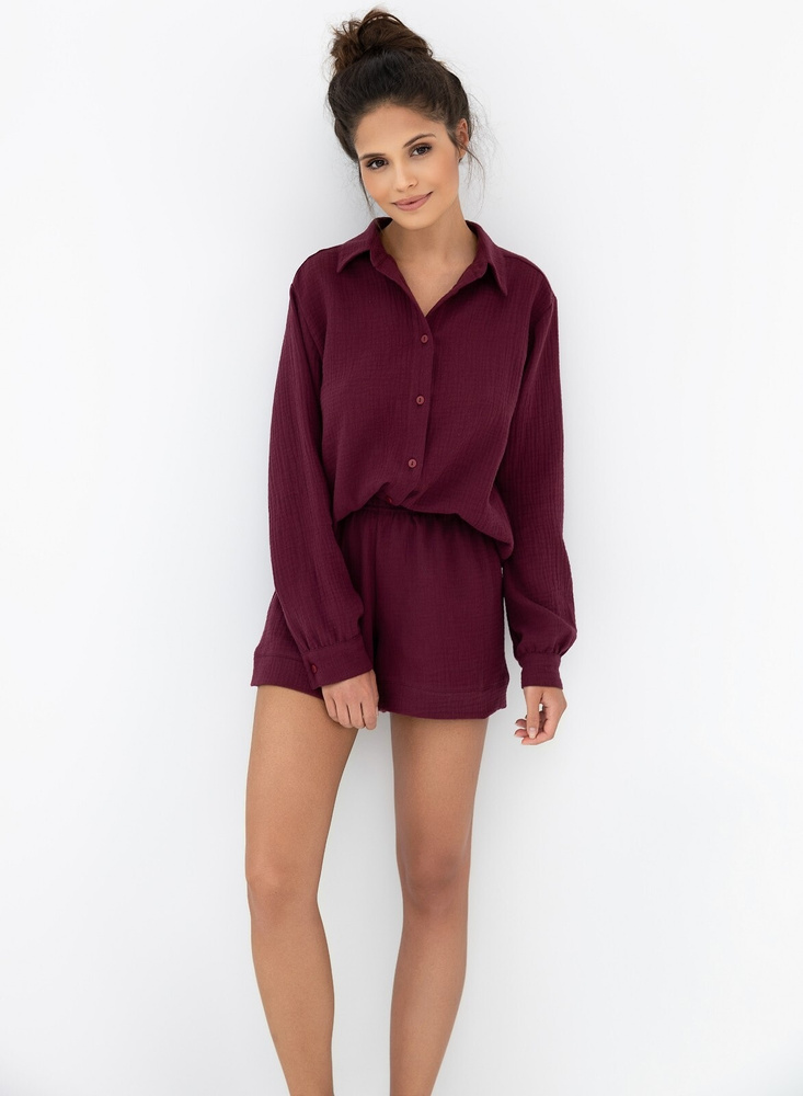 Súprava sa skladá z košele s gombíkmi a dlhý rukáv a voľné nohavice, vďaka čomu je celok praktický a veľmi pohodlný. Klasický strih košele zdôrazňuje nadčasový charakter pyžama, zatiaľ čo neutrálny odtieň slonovina dodáva mu jemnú eleganciu.
