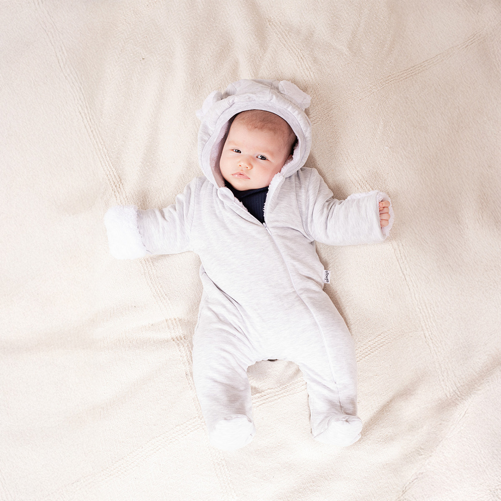 Model v svetlosivej farbe sa vyznačuje očarujúcimi ušami na kapote, ktoré celému vzhľadu dodávajú jedinečný šarm. Kombinéza má zakryté nohy a vyhrnuté rukávy. Dlhý zips uľahčuje rýchlu výmenu. Toto praktické a štýlové oblečenie pre najmenších.