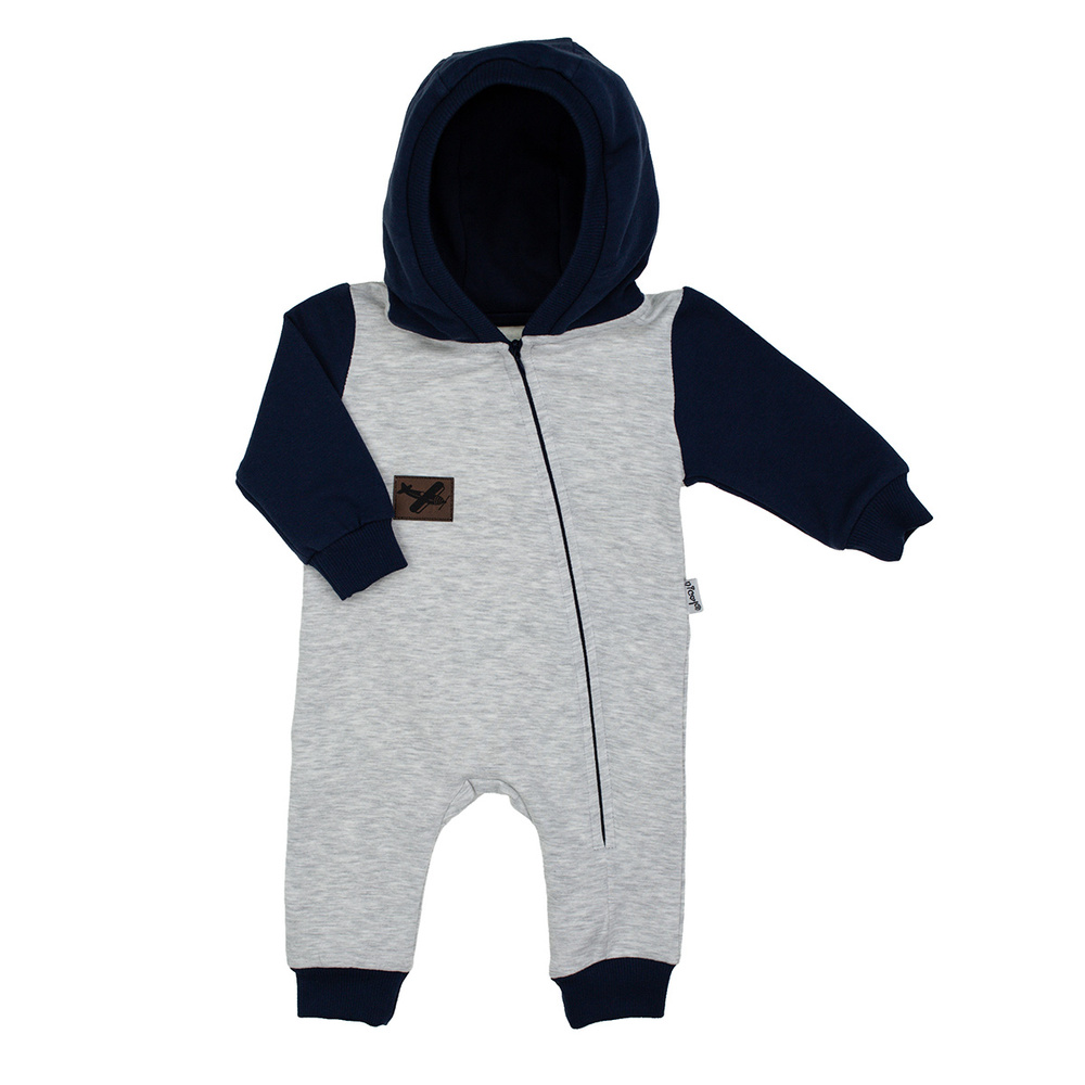 Model v módnej farebnej kombinácii sivej a námorníckej modrej má kapucňu na ochranu pred chladom a dlhý zips, ktorý sa zapína diagonálne a uľahčuje rýchle obliekanie a vyzliekanie. Elastické rebrovanie na nohaviciach a rukávoch zabraňuje vyhrňovaniu látky. Ideálna voľba na prechádzky a domácu zábavu.