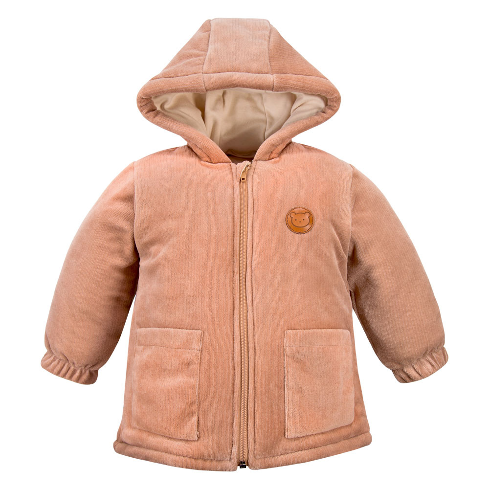 Model má praktickú kapucňu, ktorá chráni pred vetrom a mrazom, dve predné vrecká a zips na jednoduché obliekanie. Zdobí ho jemná nášivka medvedíka, ktorá spája funkčnosť s rozkošným detským štýlom.