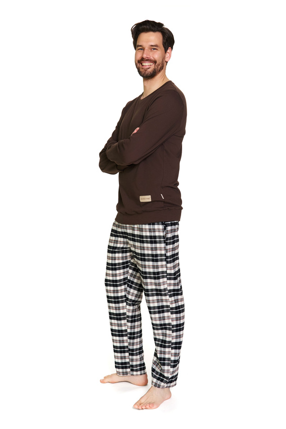 Pánske pyžamo Doctor Nap 7334 je ideálnou voľbou na jesenné a zimné noci. Vrchný diel je vyrobený z mäkkého bavlneného úpletu pre pohodlie a voľnosť pohybu. Nohavice sú ušité z kvalitného 100 % bavlneného flanelu, takže sú teplé a príjemné na dotyk. Klasický károvaný vzor v hnedých tónoch dodáva súprave nadčasový charakter. Vďaka rovnému strihu, pohodlnému pásu a prírodným materiálom je toto pyžamo ideálne na spanie aj večerný odpočinok doma.