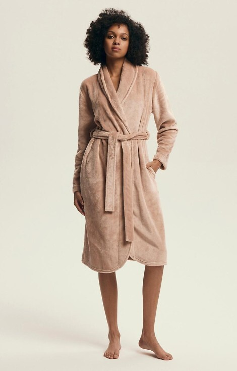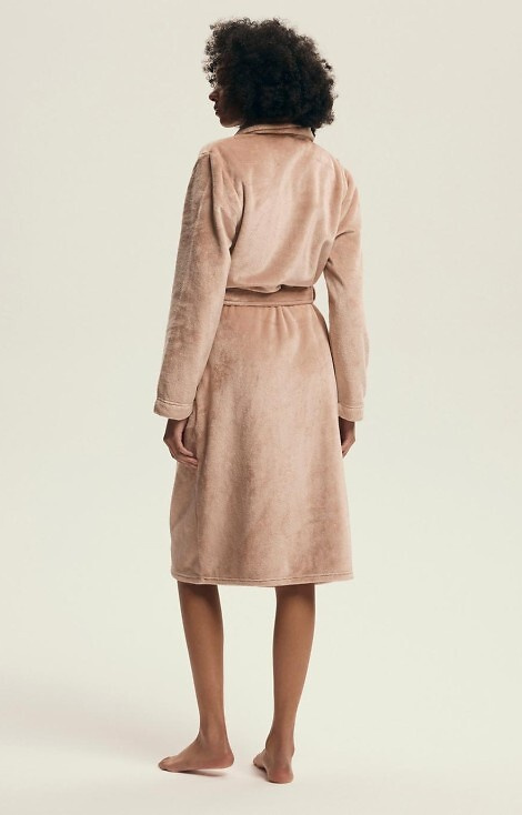 • Elegantný dámsky župan so šálovým golierom a viazaním v páse. Vyrobené z mäkkej pleteniny, ideálne na chladnejšie dni.