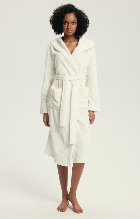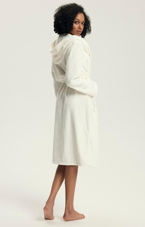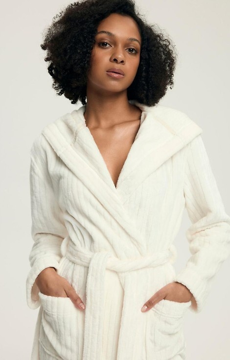 • Elegantný dámsky župan Dionne Henderson 43600. Mäkký rebrovaný úplet, kapucňa, dĺžka po kolená a praktické vrecká - ideálne na každodenné nosenie a chladnejšie večery.