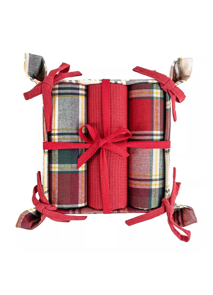 Súprava obsahuje dve utierky zdobené jemným károvaným vzorom a jednu pevnú utierku s vafľovou štruktúrou. Takáto súprava dokonale zapadne do interiéru každej kuchyne a dodá jej teplý a útulný charakter. Celé je to zabalené v ozdobnom textilnom košíku, ktorý sa dá použiť aj ako praktický organizér.