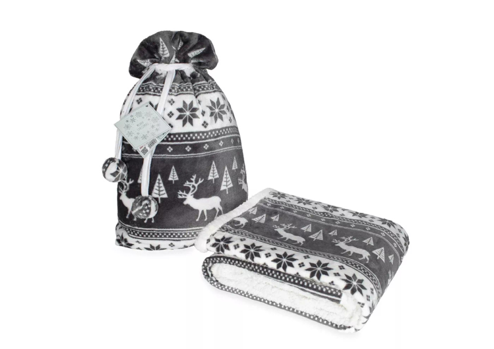 Vianočná deka SACO popol - mäkká a teplá so sobmi a vianočnými stromčekmi v ozdobnom vrecku