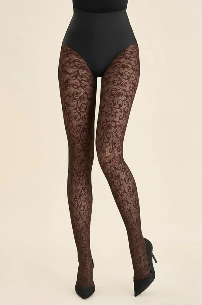 Pančuchy sa vyznačujú jemným ornamentálnym vzorom, ktorý dodáva štýlu elegantný a ženský nádych. Sú zamatové na dotyk, mäkké a poddajné pre úplné pohodlie. Model má ploché švy, malý bavlnený klin a nemá oddelenú časť nohavičiek, vďaka čomu vyzerá perfektne pod vypasovaným oblečením.